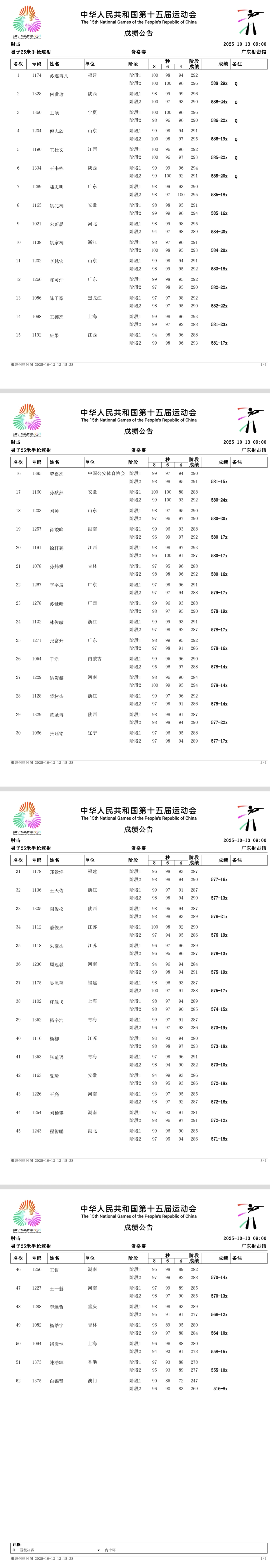 【赛事成绩】第十五届全国运动会射击男子25米手枪速射资格赛成绩公告(10月13日)