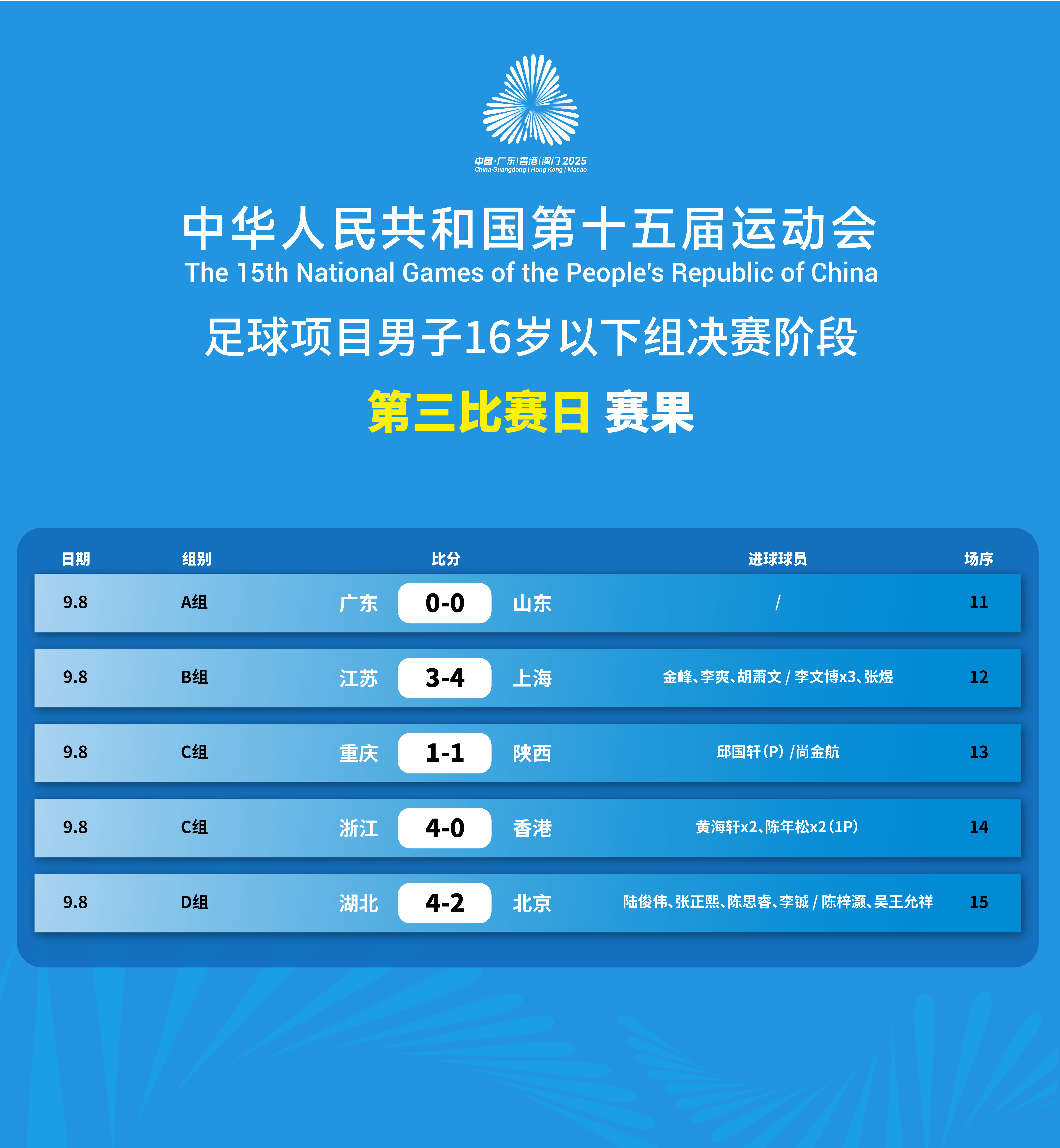 【赛事成绩】第十五届全国运动会男足16岁以下组(第三比赛日赛果)