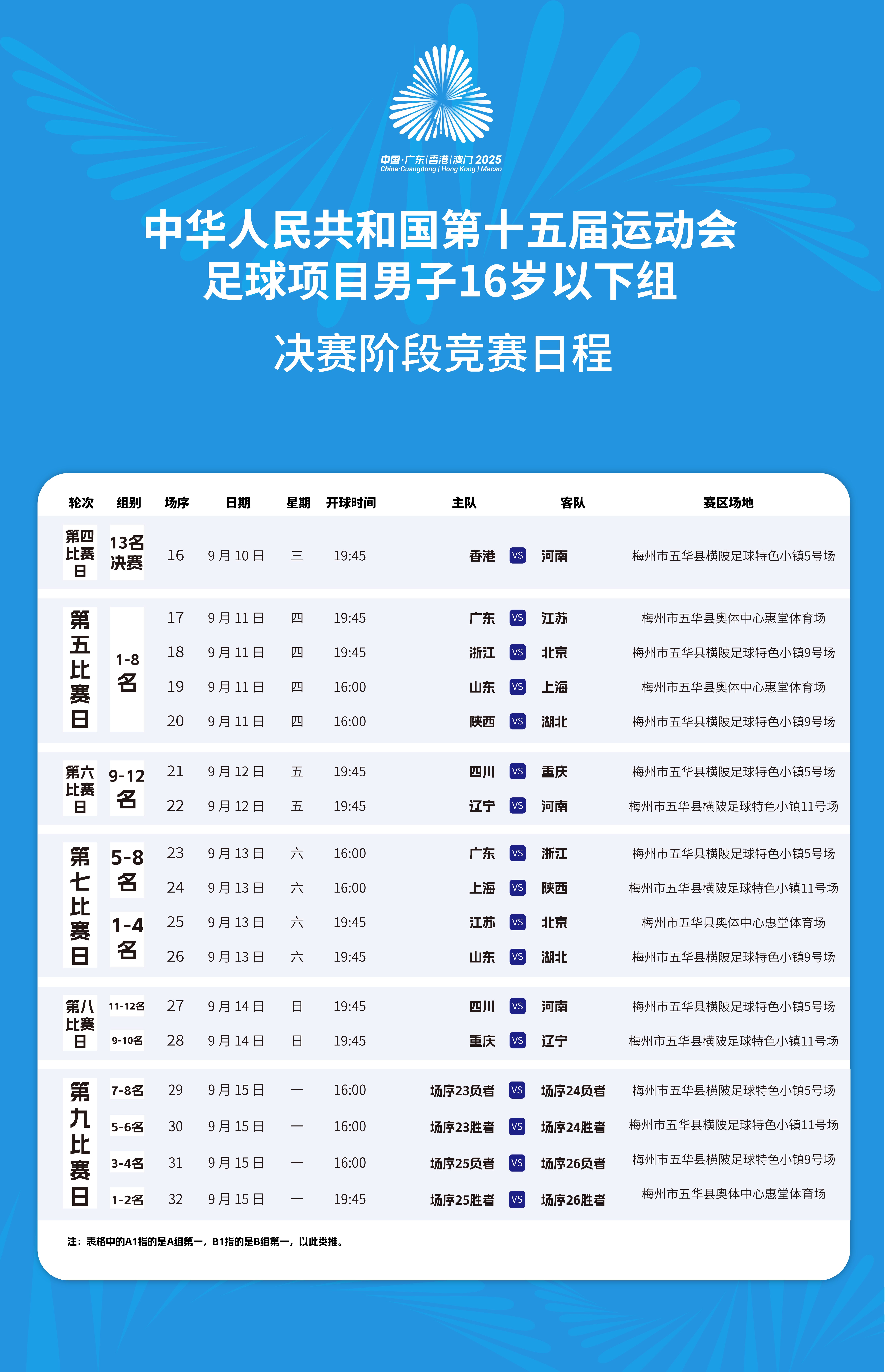 【竞赛日程】第十五届全国运动会男足16岁以下组决赛阶段竞赛日程