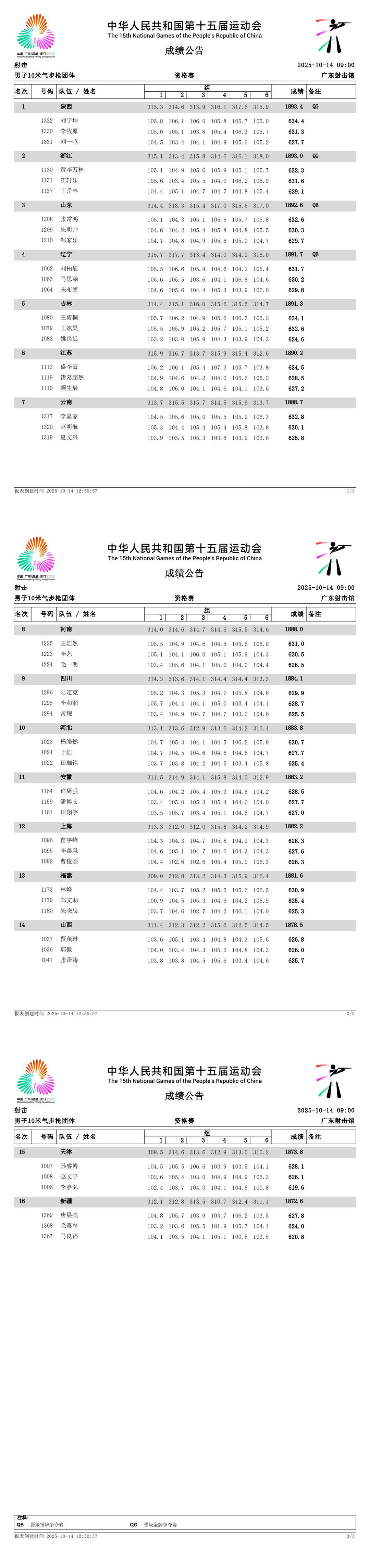 【赛事成绩】第十五届全国运动会射击男子10米气步枪团体资格赛成绩公告(10月14日)