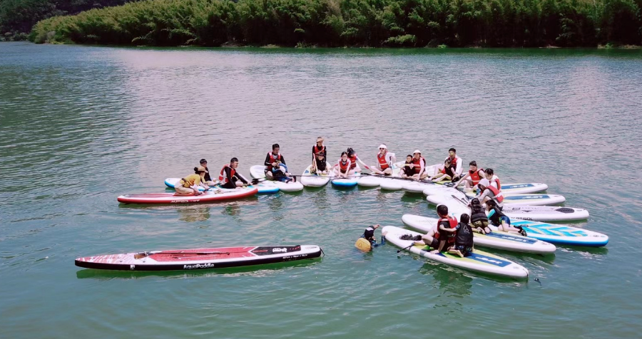 一泓清水两岸绿,挥桨划过,水面泛起层层涟漪,美丽如画。兼具酷炫、清凉、趣味和社交属性的赛艇桨板运动,结合丹山碧水的美景,受到广东各地年轻人和家庭的追捧。