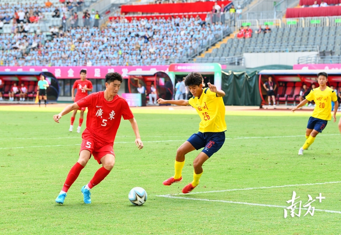 9月4日,十五运会男子足球首个竞体项目U16组决赛阶段比赛在梅州打响。首场比赛,广东队4比1战胜四川队。南方日报记者 何森垚 摄