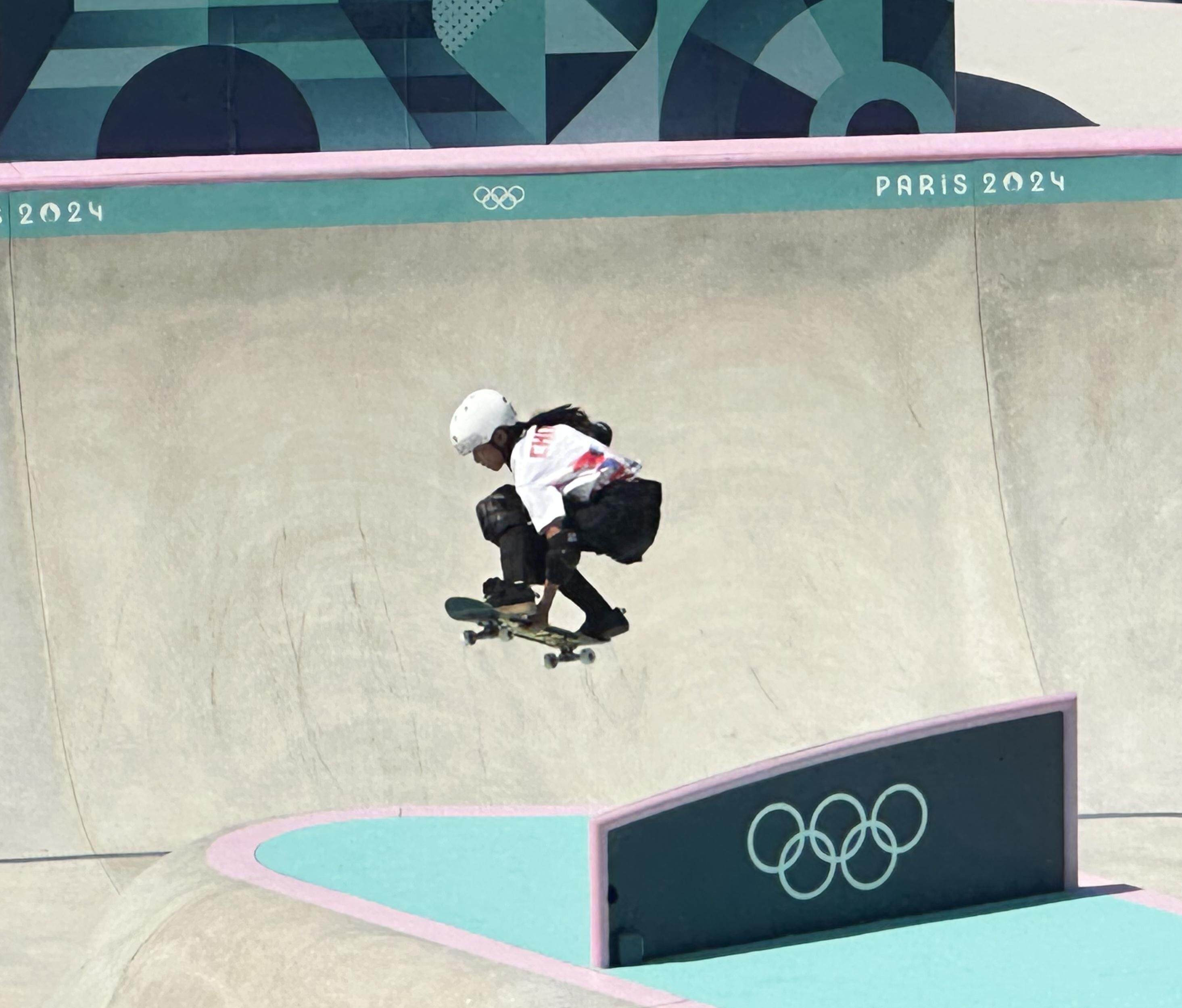 蹬地、前冲、飞起、转身……郑好好完成这一系列动作后,开始总结不足。2024年,年仅11岁的郑好好以奥运选手的身份参加巴黎奥运会的滑板碗池比赛,成为中国代表团中年纪最小的运动员。作为在惠州成长起来的滑板运动员,她已成为惠州滑板运动的“代言人”。