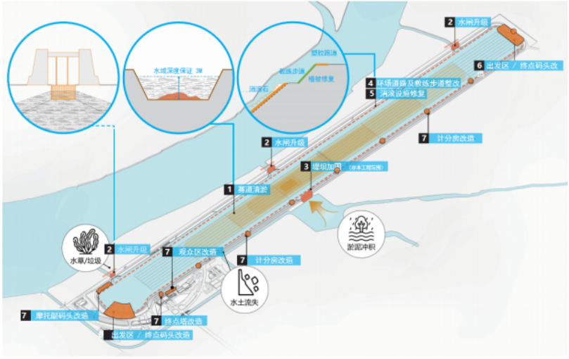 升级难点:枯水期缺水制约赛事保障;传统赛道依赖高能耗水泵,与低碳目标矛盾;原设施无法满足国际新标准。