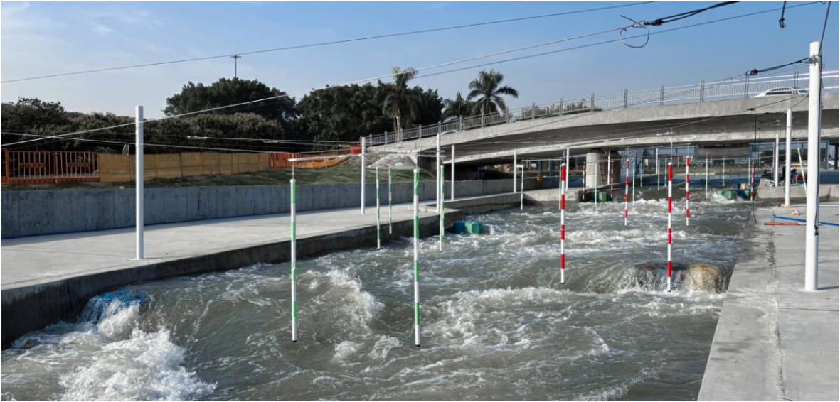 激流回旋赛场:创新顶管工程打通地下引水通道,枯水期补给流量可达2m³/s,全年90%天数免水泵运行;赛道增设可调节障碍门,灵活适应奥运级赛事与青少年训练需求;雨水花园+透水铺装系统实现场地径流零外排,节水器具用水效率等级不低于2级标准。