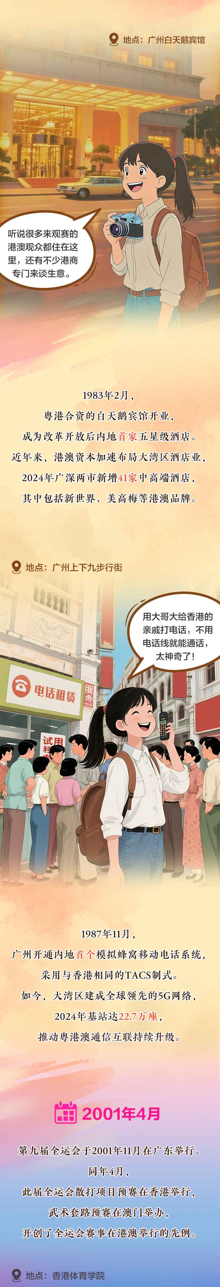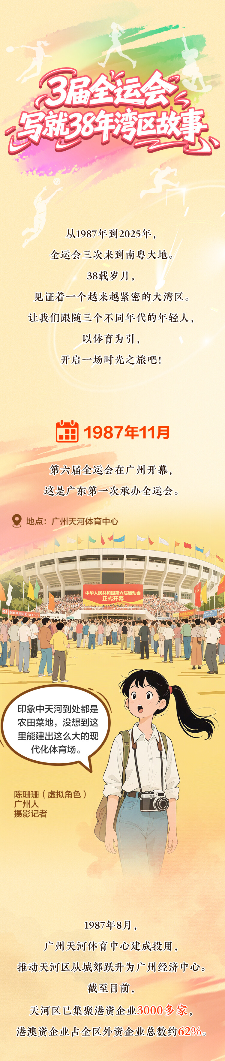 回望过去,全运会这场体育盛会,与大湾区的缘分深厚绵长。1987年,在改革开放的春风中,广州首次接过全运会的接力棒;2001年,全运会再度花落广东,并开创港澳举办全运赛事的历史先河;2025年,粤港澳三地将首次携手,共同谱写全运新篇章。三届全运会,见证了大湾区由相互连接到深度融合的发展历程,也串联起几代人对青春与梦想的共同记忆。