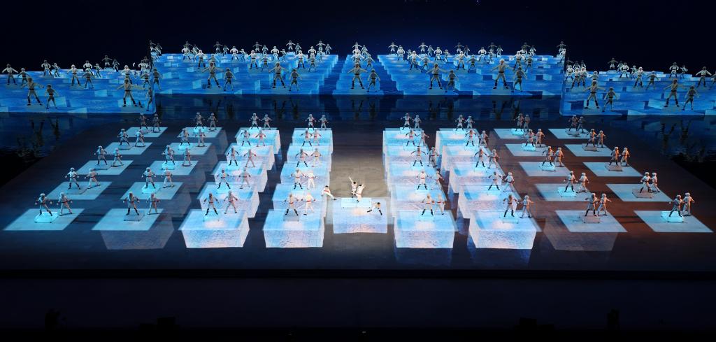 垂落而下的光影纱幕,倏然间如同冰封雪原般“矗立”场中,有限空间被延展为一片“无限”天地。借助创意电子和智能编程所集成的数控发光服装和反重力倾倒装置,各类比赛项目在表演者交互驰骋和风驰电掣间一一展现,“交互冰球”“时间切片”“子弹时间”……中国的科技创新之光在此刻熠熠生辉,留下力与美的精彩瞬间。