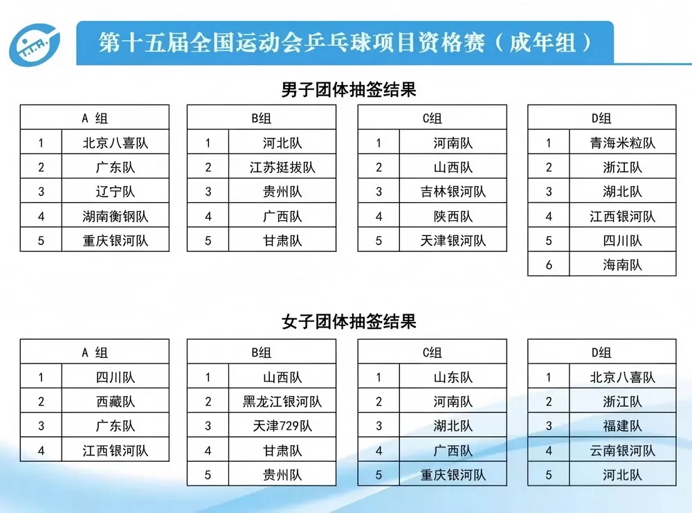 男女团体资格赛分别将参赛队伍分为4个小组进行循环赛,小组前三名获得决赛阶段参赛资格。根据抽签结果,由夏易正、牛冠凯、于何一、宋卓衡、张剑皓组成的河南乒乓球男队与山西队、吉林队、陕西队、天津队同在C组;由袁雪娇、马菀含、金梦妍、王姝、林雨涵组成的河南乒乓球女队与山东队、湖北队、广西队、重庆队同在C组。
