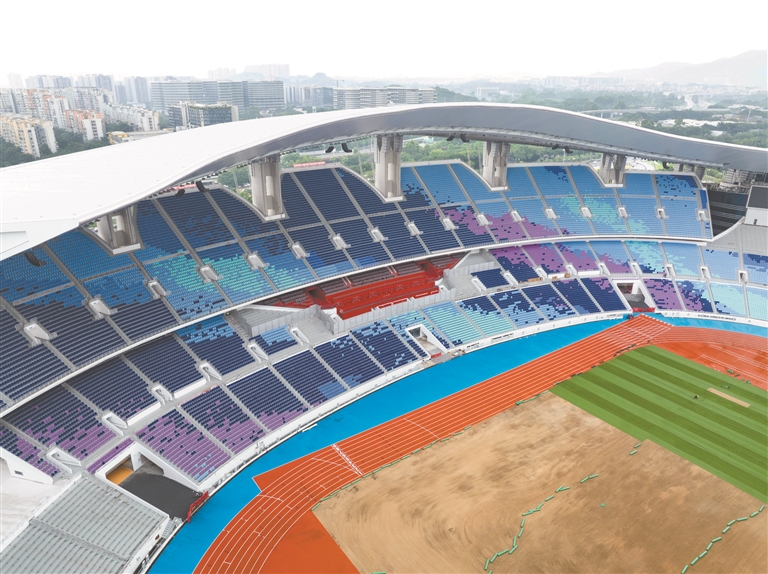 6月10日,记者提前对广东奥体中心田径场进行探营。场馆外观呈现了“珠水奔流、湾区浪涌、一脉相承、激流勇进”的设计理念。屋面吊顶强化“飘带意象”,花瓣看台凸显“木棉意象”、水平平台形成“浪潮意象”,广场景观呈现“珠水意象”,并广泛采用海蓝色系,体现大湾区特色。广东奥体中心改造项目建筑设计负责人郭嘉表示,场馆的观众座位采用了四种不同的蓝色,形成“湾区环流”的形象表达,此外还增加了红色、紫色以及绿色三种主色调,形成“活力湾区、激情全运”的形象表达。