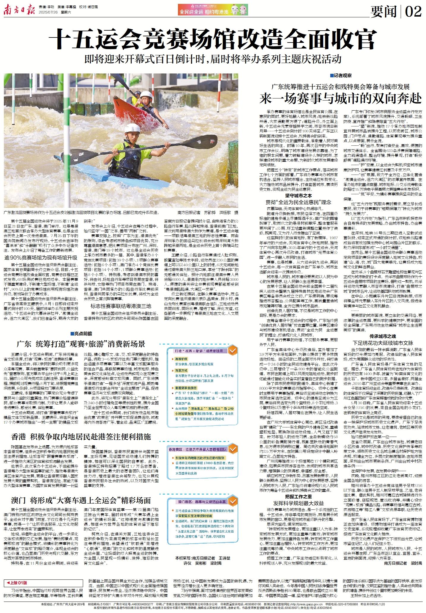 承办赛事的体育场馆也是全民体育公园,在惠民的同时,更好地融入城市风貌;地铁新线路开通,大家通勤更方便了;道路升级,外立面上新,十五运会元素穿插楼宇之间,市容市貌日新月异……十五运会倒计时100天将至,广东正以崭新面貌迎接十五运会、残特奥会的到来。