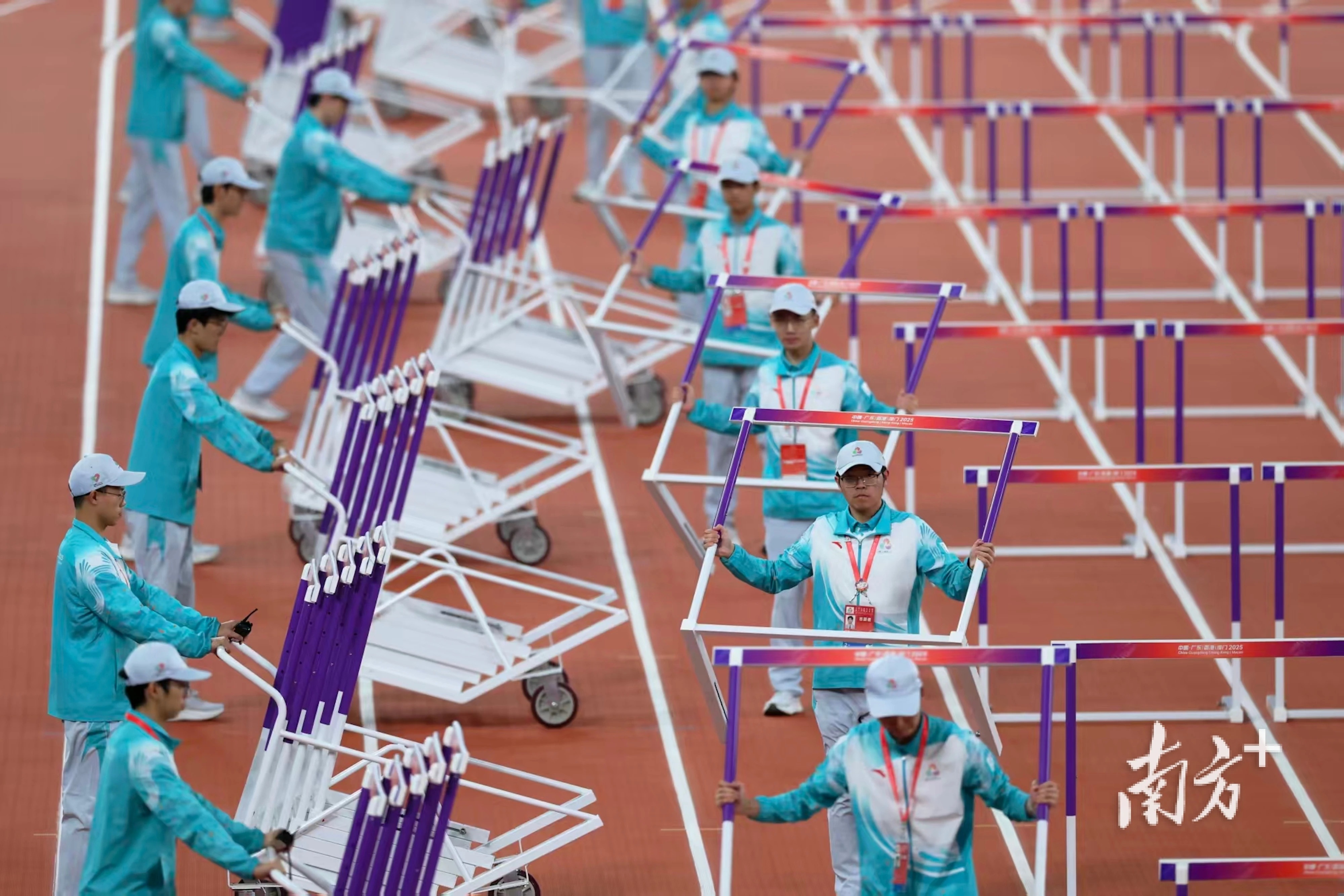 11月19日晚,十五运会田径项目跨栏比赛开始前,志愿者在进行准备工作