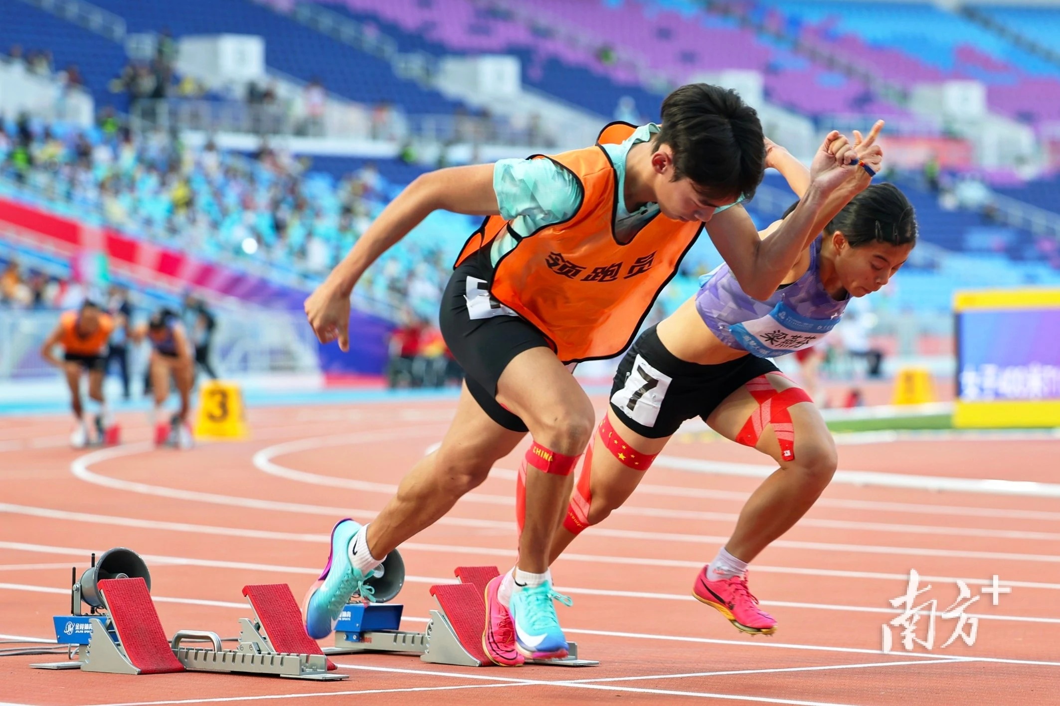 12月11日,残特奥会田径项目女子400米T12级决赛,领跑员田皓宇带广东选手梁燕芬开跑