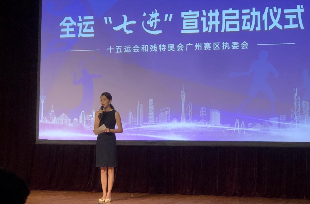 5月6日,全运“七进”宣讲启动仪式在广州图书馆举行,海珠区教育局教师刘思霖、暨南大学大四学生刘嘉熙、华师附中花都学校教师林雪和广东广播电视台体育频道主持人央金先后作了主题宣讲。十五运会和残特奥会广州赛区执委会副主任、广州市政府副秘书长朱小燚等嘉宾出席,并为“七进”活动单位授旗。