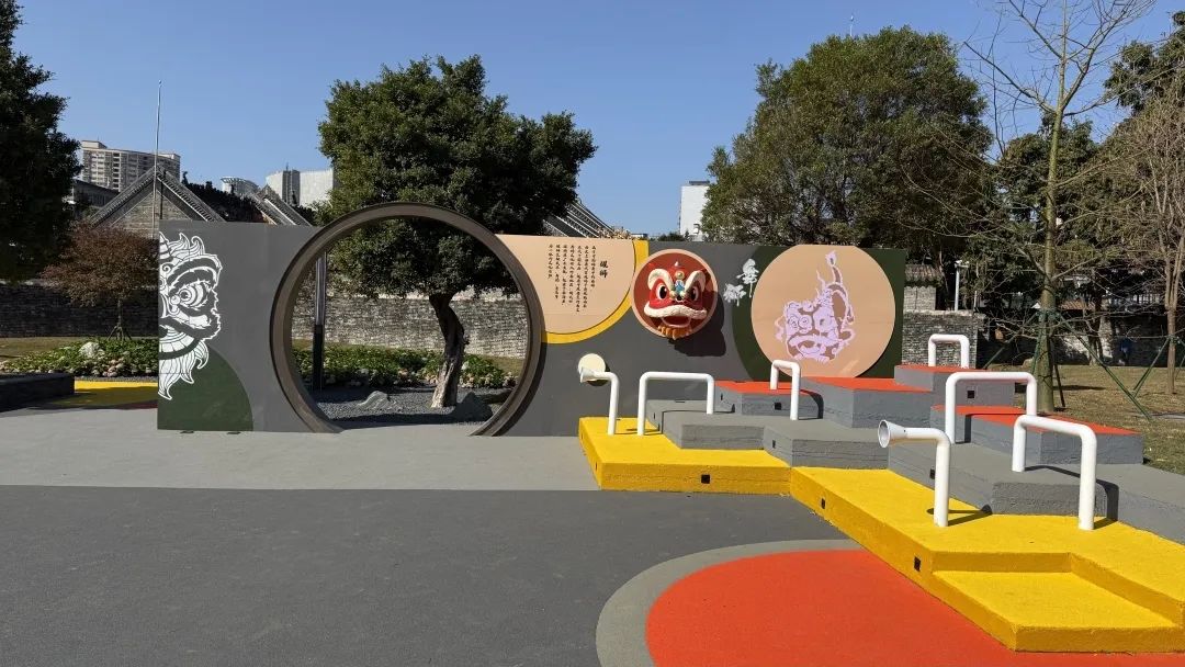 设计团队深度挖掘地域文化基因,将陈家祠建筑的青灰色调与灰塑彩绘元素融入广场。慢跑径的颜色,就是取自陈家祠山墙上的朱红。“摸摸狮子头,万事唔使愁(不用愁)。”广场上,高度精心设计、孩童触手可及的醒狮雕塑,以国家级非遗灰塑工艺打造,让小朋友亲手感受传统工艺的魅力。广场成为陈家祠文化内涵的外延空间,让市民游客“零距离”体验本土手作,实现了把非遗“种”在城市里的文化传承理念。