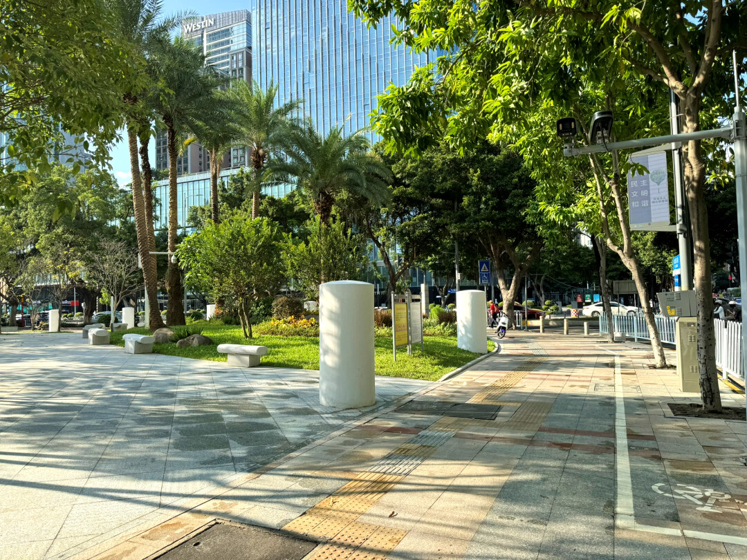 面对历史,城市品质提升工作保持敬畏和谦逊,不“喧宾夺主”。国家级文保单位陈家祠东侧,尘封十余年的广场今年焕新开放。为了确保陈家祠主体建筑立面不被遮挡,提升工程控制绿植高度与密度,所有构筑物的高度均低于陈家祠围墙,让市民在广场上的每一个角度都能完整欣赏文保建筑的天际线。