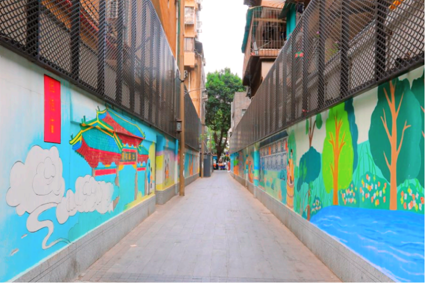 西关记忆项目植入文化彩绘,涵盖本地故事与岭南特色文化元素,提供充满活力和文化气息的生活空间。项目在泮塘五约新街的内巷人文径,精心改造居民房前屋后的低效空间,打造充满生机的树下交往场所,重新铺装路面,增设绿植和休憩座椅,让曾经杂乱的角落蜕变为活力生活场域。
