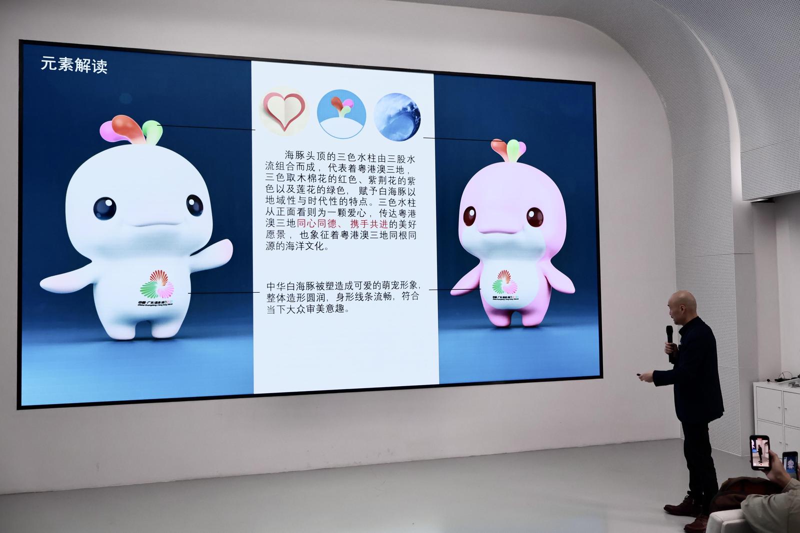 设计团队曾以白海豚头顶三朵花来作为代表三地的符号,刘平云笑称这是一个由丑变靓的过程,最终敲定头顶的三色水柱由三股水流组合而成。“三个小水珠是符合白海豚的生理特性,也传达出粤港澳三地同心同德、携手并进的美好愿景。”刘平云表示,吉祥物一白一红的颜色选择也符合白海豚的特征,白海豚在慢慢成长后一旦运动就会呈现红色。