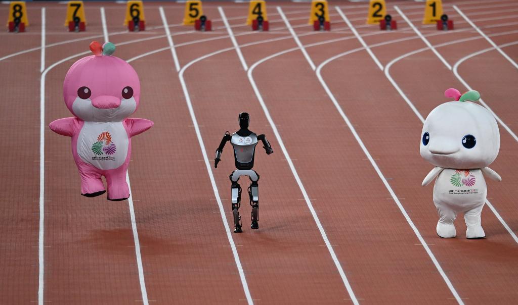 11月17日,在田径项目赛事开始前的暖场活动中,机器人和吉祥物“喜洋洋”“乐融融”在广东奥体中心体育场赛跑。新华社记者 周牧 摄