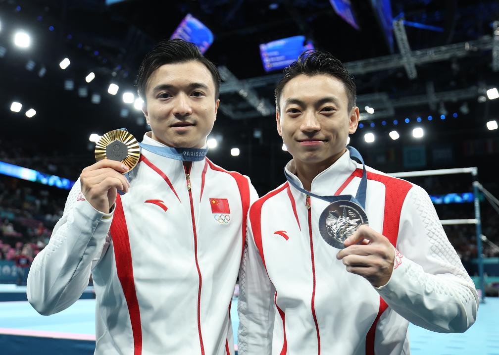8月4日,冠军刘洋(左)、亚军邹敬园在男子吊环颁奖仪式后合影。新华社记者 曹灿 摄