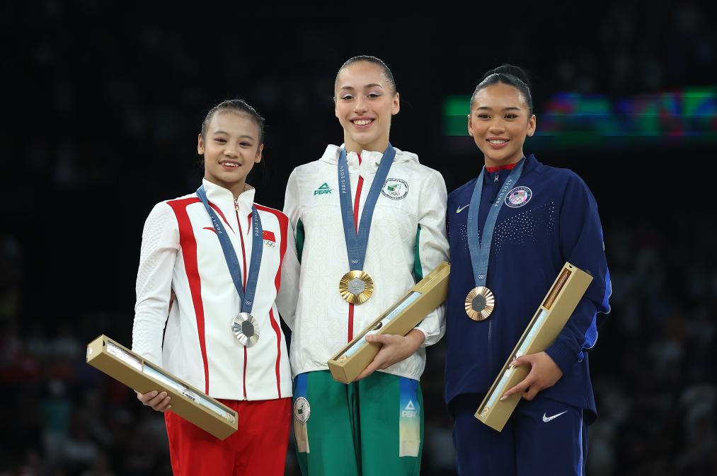 8月4日,冠军阿尔及利亚选手内穆尔(中)、亚军中国选手邱祺缘(左)和季军美国选手苏妮莎·李在女子高低杠颁奖仪式上。新华社记者 曹灿 摄