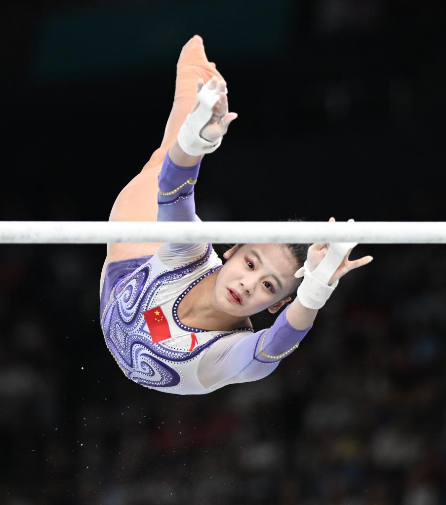 8月4日,中国选手邱祺缘在女子高低杠比赛中。新华社记者 程敏 摄