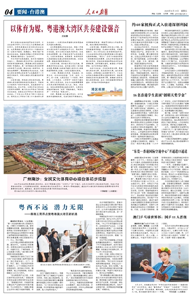 第十五届全运会组织委员会近日宣布,十五运会将于明年11月9日至21日在粤港澳大湾区举行。这将是港澳地区首次参与承办全运会,也是粤港澳大湾区首次作为一个整体承办这一全国水平最高、规模最大、影响力最广的综合性运动会。随着各项筹备工作紧张有序推进,粤港澳正携手进入“全运时间”。