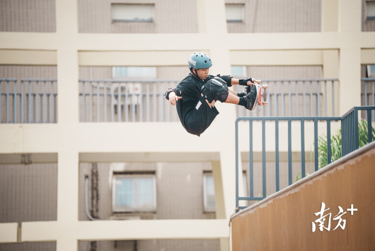 4月9日下午,在惠州体育运动学校滑板场,十余岁的队员们身轻如燕,脚踩滑板仿佛御风而行,蹬地、前冲、飞起、转身等动作一气呵成,俨然已进入紧张有序的备战状态。