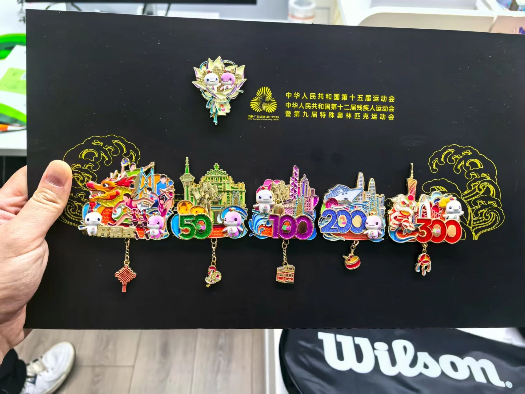 我还有十五运会和残特奥会的会徽徽章,我在北京奥运博物馆把这枚徽章送给了国际奥委会前主席,现在是国际奥委会终身名誉主席巴赫。我还在收集十五运会和残特奥会倒计时系列的徽章,马上就出100天的倒计时徽章有香港的元素,还有港珠澳大桥, 这套倒计时系列徽章设计得很精美。另外我看到最新出了十五运会和残特奥会的十二生肖的毛绒吉祥物,我觉得很可爱,我一定要把它们都收藏了。我还希望能够推出太空版的十五运会和残特奥会吉祥物,两个可爱的海豚穿上太空服探索太空一定很有意思,太空版的吉祥物一定会受到欢迎的。