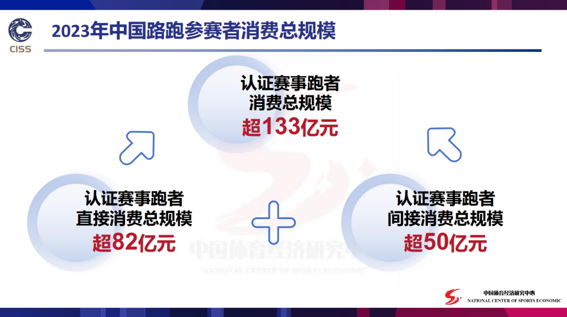 “这两年很多大型马拉松赛事报名人数屡创新高,一些城市不断扩大赛事规模。”国家体育总局体育科学研究所中国体育经济研究中心副研究员赵轶龙表示,“马拉松赛事在全国范围内遍地开花,不仅带活了体育消费,也带火了举办城市。体育赛事正成为城市促进经济社会发展的一大发力点。”国家体育总局体育科学研究所中国体育经济研究中心日前发布的《特征与趋势洞察:中国跑者的运动参与和消费》进一步印证了这一观点:在2023年中国路跑参赛者消费中,认证赛事跑者消费总规模超133亿元,其中直接消费总规模超82亿元,间接消费总规模超50亿元。