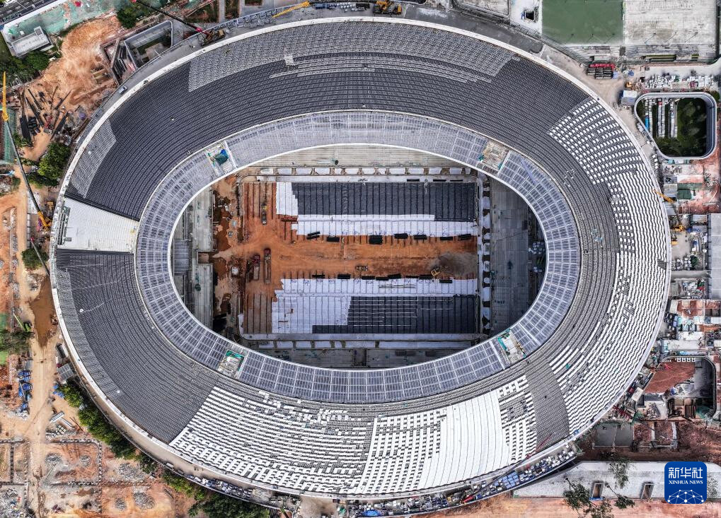 这是10月16日拍摄的正在进行屋顶幕墙施工和场地及看台坐席改造的深圳市体育中心专业足球场。专业足球场可同时容纳四万五千名观众。