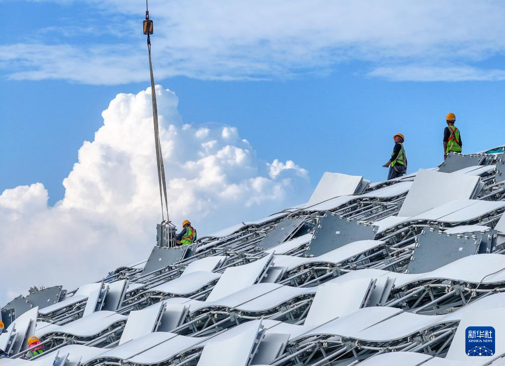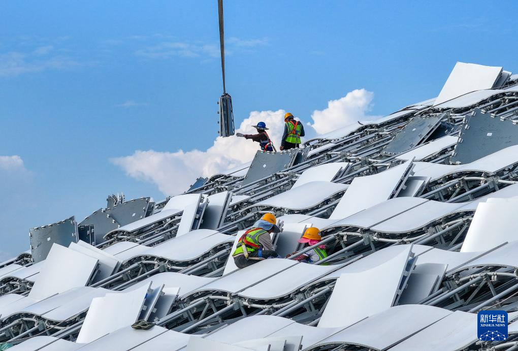 10月16日,施工人员在深圳市体育中心专业足球场屋顶吊装幕墙材料(无人机照片)。