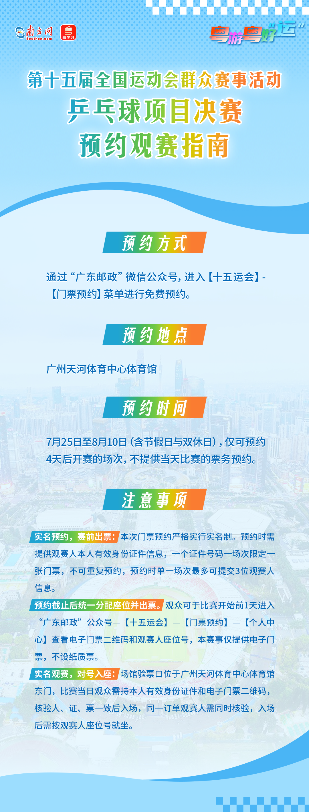 据了解,第十五届全国运动会群众赛事活动乒乓球项目决赛将于8月8日至14日在广州天河体育中心体育馆、广州市羽毛球运动管理中心举行,共设2项混合年龄组团体赛事及8项各年龄组单打赛事。其中,广州天河体育中心体育馆可免费观赛,快来现场为十五运会加油喝彩!