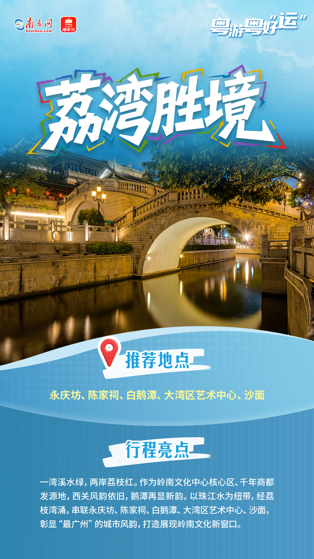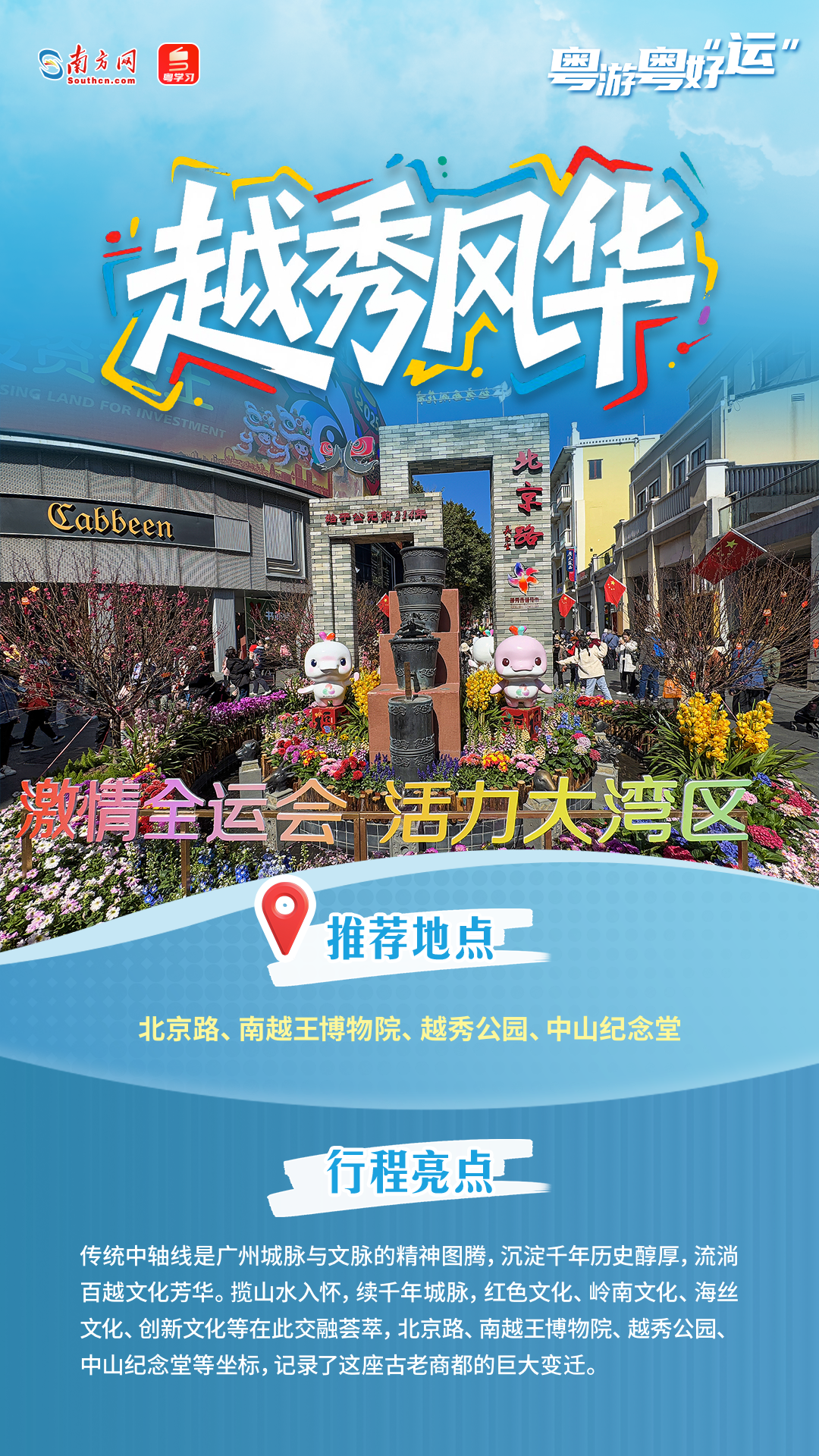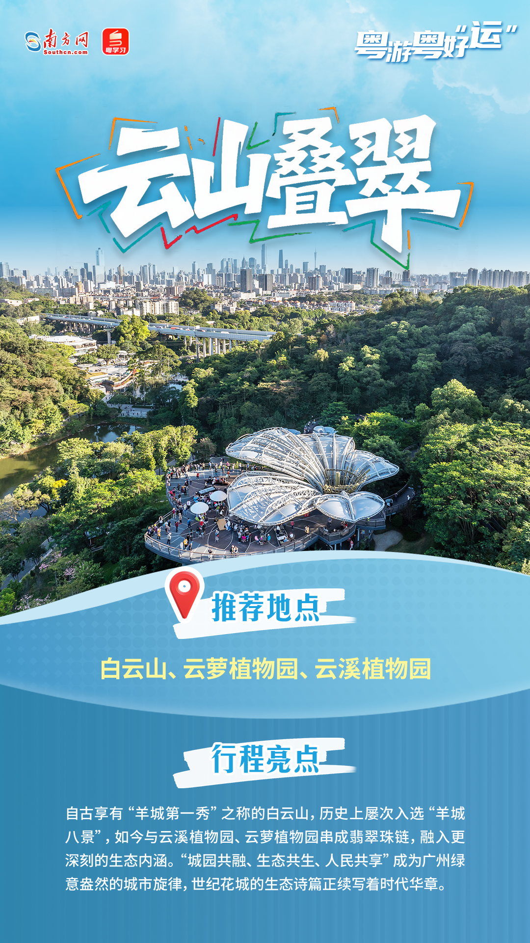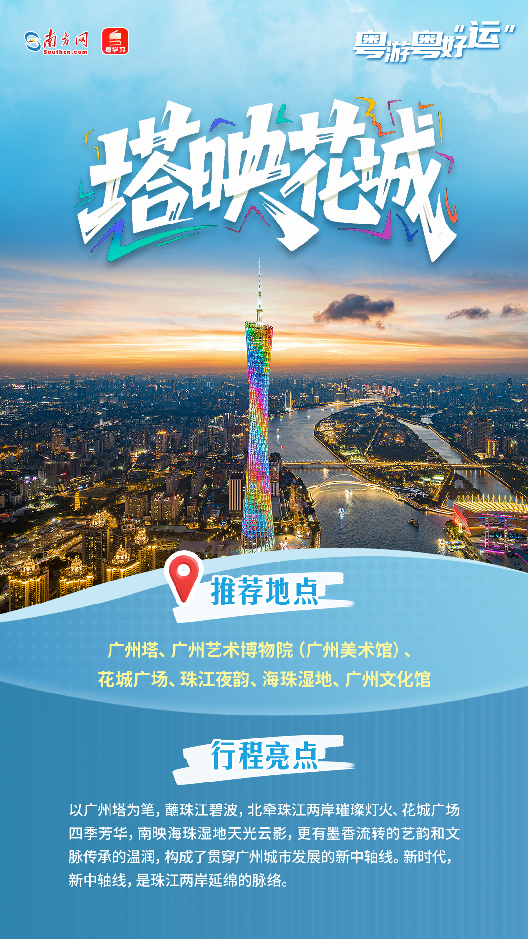 在广州的千年历史中,有一个城市“选美”活动从宋朝延续至今未曾间断,那就是“羊城八景”的评选。在十五运会和残特奥会倒计时100天之际,延绵千年的“羊城八景”评选名单正式揭晓,分别是塔映花城、云山叠翠、越秀风华、荔湾胜境、南沙旭日、黄埔云帆、欢乐长隆、流溪烟渚。让我们循着这张积淀千年的“城市名片”,感受广州“老城市新活力”的独特魅力。