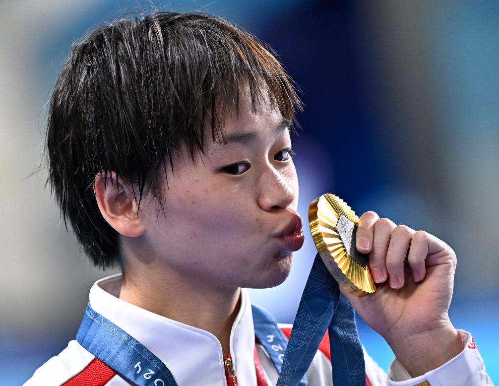 8月6日,全红婵亲吻金牌。新华社记者 王鹏 摄