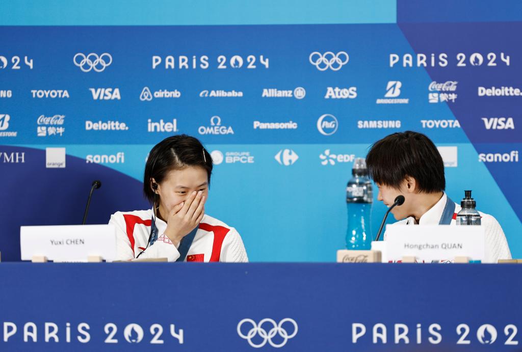 8月6日,全红婵(右)和陈芋汐在赛后记者会上。新华社记者 张玉薇 摄