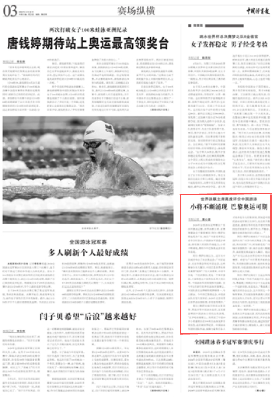 阿尔·穆萨拉姆认为,近年来中国成功举办了北京奥运会、广州亚运会、北京冬奥会和杭州亚运会,这些赛事令世人瞩目。中国已是世界体育的重要“版图”。“在大家看来,中国不仅是一个经济强国,更是一个体育强国,大家都想去中国参加各类大型比赛。中国游泳军团表现相当抢眼。在今年2月举行的多哈游泳世锦赛上,中国队排名金牌榜和奖牌榜第一,令人振奋。今年的巴黎奥运会,中国游泳队有望大放异彩。2029年北京将承办世界游泳锦标赛,非常值得期待。”