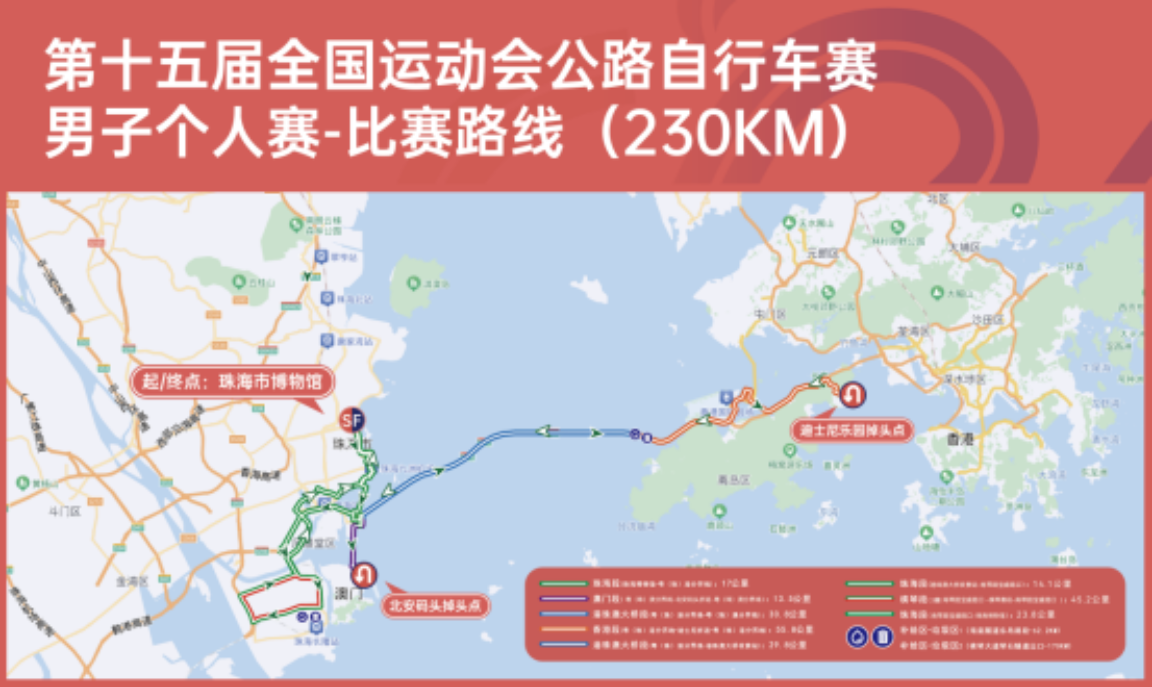 2024粤港澳公路自行车赛暨第十五届全国运动会公路自行车测试赛,定于2024年11月24日举行,比赛项目为男子个人赛,该赛事起终点设置于珠海市,从珠海市博物馆出发,途经澳门、港珠澳大桥、香港(折返)、港珠澳大桥、横琴粤澳深度合作区、返回珠海市博物馆,联结粤港澳三地,总里程230公里。