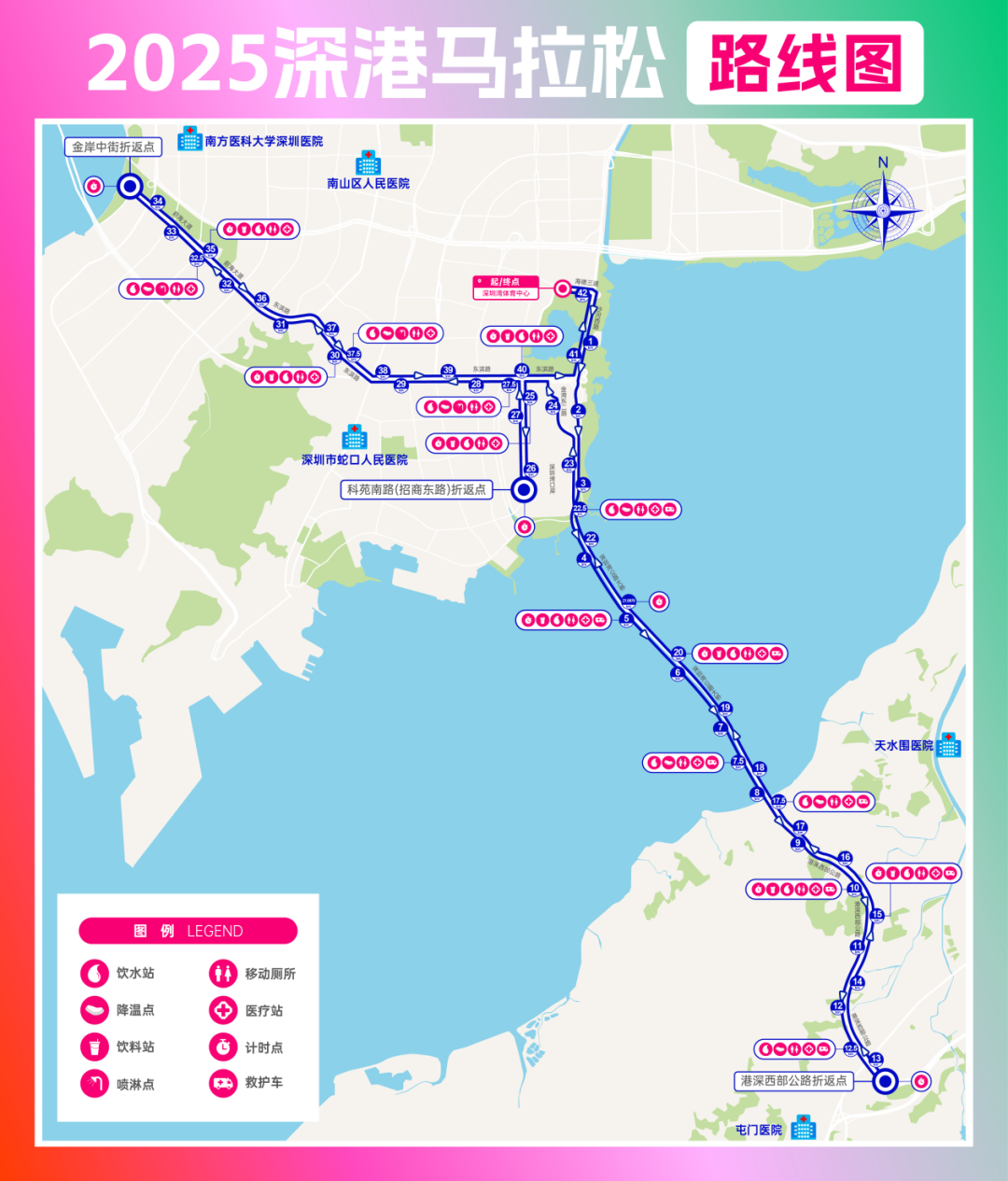 比赛路线独具特色,以深圳湾大桥为纽带,横跨深圳、香港两地,全程 42.195 公里,其中香港段 21.841 公里,深圳段 20.354 公里,起点和终点均设在深圳湾体育中心。深圳段途经南山区和前海,香港段位于元朗区。赛道首次将深圳湾大桥纳入其中,跨越深圳湾,串联起深圳国家高新区、前海蛇口自贸片区、深港现代服务业合作区、深圳城市核心区以及香港自然生态区,形成了 “一湾五区” 的独特路跑场景。
