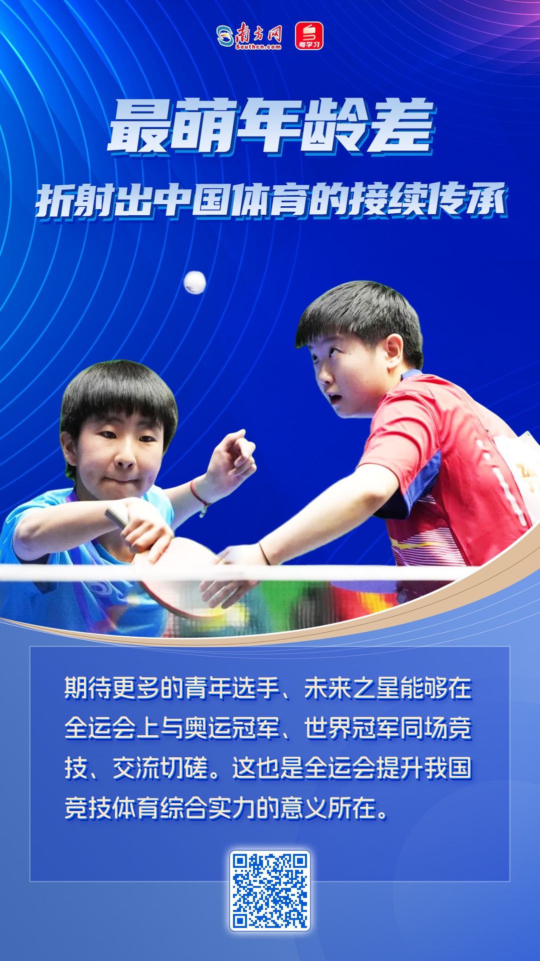 这场“最萌年龄差”的比赛折射出中国体育一种宝贵的传承。王宣贻的亮相,印证了全运会选拔机制的成效,也让国内顶尖选手在和新生代选手的同场竞技中亲身发挥了“传帮带”作用。这场比赛乃至这次全运会资格赛,也展现了中国乒乓球项目、中国体育系统丰富的人才储备。期待更多的青年选手、未来之星能够在全运会上与奥运冠军、世界冠军同场竞技、交流切磋。这也是全运会提升我国竞技体育综合实力的意义所在。