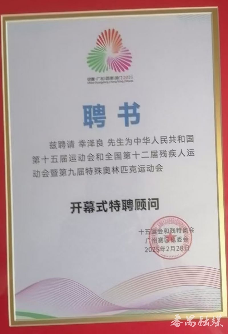 幸泽良(左一)被聘为中华人民共和国第十五届运动会和全国第十二届残疾人运动会暨第九届特殊奥林匹克运动会开幕式特聘顾问
