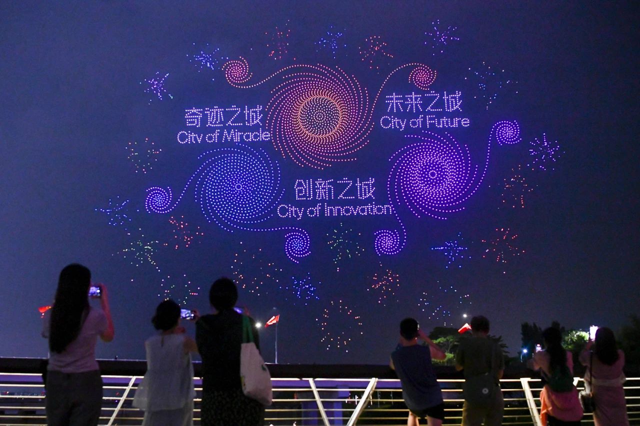 市民、游客在深圳湾观看无人机表演。新华社资料图
