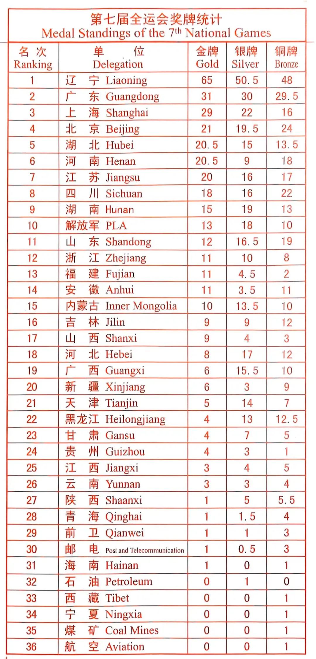 中华人民共和国第7届运动会于1993年8月15日至9月15日分别在四川省(8月15日—8月23日)、秦皇岛市(8月24日—9月2日)、北京市(9月4日—9月15日)举行。本届运动会首次由三地协办。全运会共设置43个比赛项目,北京承办包括田径、游泳、体操、艺术体操、举重、击剑、柔道、国际式摔跤、拳击、现代五项、马术、中国式摔跤等总共26个项目;四川承办包括跳水、水球、花样游泳、技巧、射击、射箭、赛艇、皮划艇、蹼泳、滑水等项目在内的15个比赛项目。另外,秦皇岛市承办了帆船和帆板两个项目。北京主赛区共有包括解放军和行业体协在内的45个代表团的4228名运动员参加。参加这次全运会的有30个省、自治区、直辖市、解放军和14个行业体协共45个代表团,运动员10510人,总规模达21000多人。与以往历届相比,这届全运会规模最大,参赛人数最多。