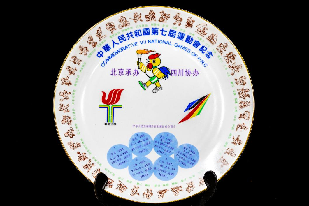纪念盘直径26cm,厚2.8cm,材质为瓷,色彩丰富,制作精美。盘内所绘图案为对称分布,包含第七届全运会会徽、吉祥物等元素,以及主办城市、协办城市、历届全运会简介等信息。其中会徽与吉祥物图案清晰醒目,会徽形象为燃烧的火炬,火焰由罗马数字VII变形而成,手柄由跑道造型的对称数字7构成,寓意着第七届全运会。吉祥物形象为公鸡“明明”。纪念盘外侧用褐色线条绘制了43个吉祥物造型的体育图标,将灵动可爱的全运会吉祥物与运动项目融合,图案生动,趣味十足。这件纪念盘将全运会的视觉形象、赛事信息集中呈现,不仅是一件融合了文字与设计的体育藏品,也是一件精致的艺术品。