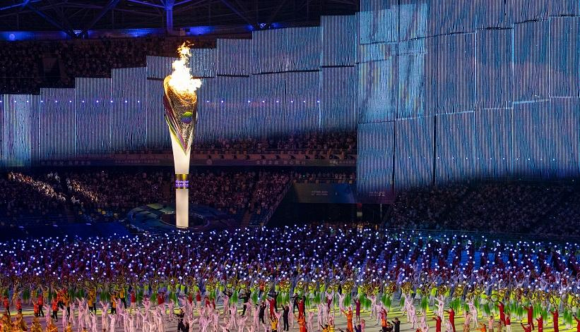 十四运会开幕式上主火炬点燃。记者 赵晨摄(图源:2021第十四届全运会)