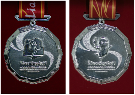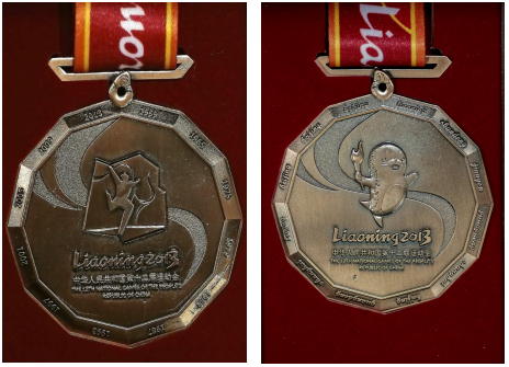奖牌正面印有第十二届全运会会徽,十二边印有历届全运会举办时间。背面印有本届全运会吉祥物,十二边对应印有历届全运会举办地。奖牌的连接环为玉猪龙造型,玉猪龙是辽宁出土的文物,也是红山文化的代表,象征着对华夏文明的精神传承,也寓意着全运会对中华文化与精神的彰显。