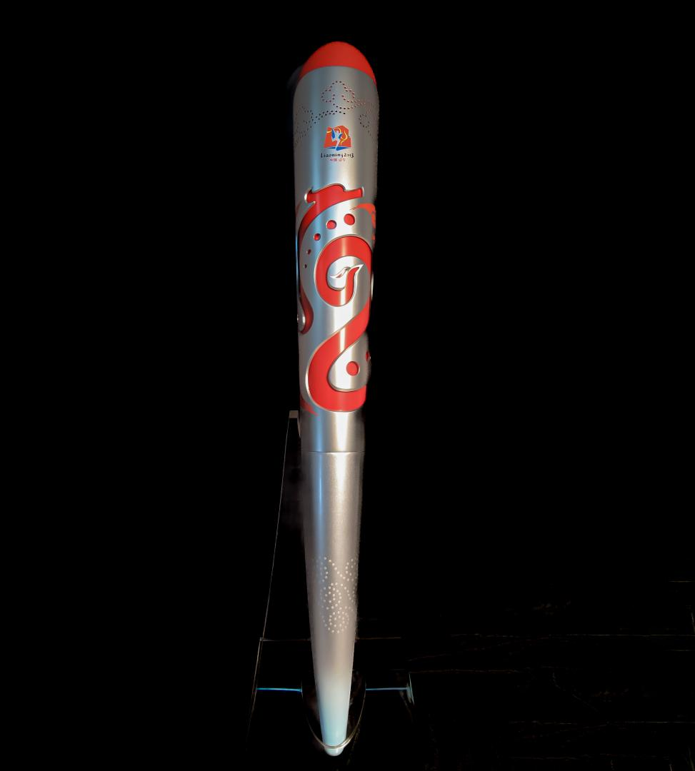 第十二届全运会火炬高72.5cm,口径8.6cm,材质为金属。火炬外观以银色和红色为主色调,整体造型灵感来源于海洋中的尖角海螺,将龙凤、火纹、浪花作为主图案,组成“12”字样。火炬正面印有本届全运会会徽,会徽融合了数字“12”造型、主办省辽宁的拼音缩写“LN”造型、灵动优美的中华龙鸟造型以及动感有力的运动人形,图案简洁,动感十足,色彩鲜明。