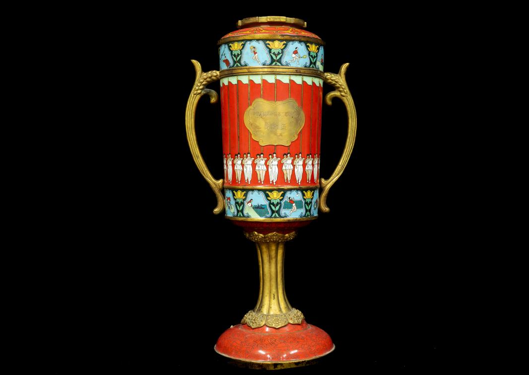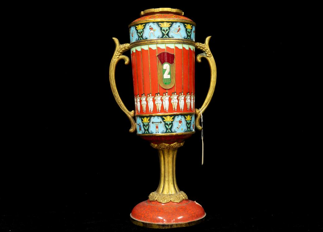 纪念杯高43cm,耳距24cm,为金属材质。杯身主体绘有24面红色旗帜以及男、女各24名运动员,凸显本届开幕式“革命赞歌”的主题和宏伟场景。纪念杯正面铭牌印有“中华人民共和国第二届全运会纪念杯”字样;背面印有第二届全运会会徽,会徽由金色的跑道与鲜艳的红旗组成,象征着高举社会主义的伟大旗帜。杯身两端及顶部印有本届全运会设置的22个运动项目。纪念杯图案生动、色彩鲜艳、纹饰丰富,彰显出1965年第二届全运会振奋人心、增进团结、展现力量的深刻历史意义,是我国体育事业发展历程的珍贵见证。