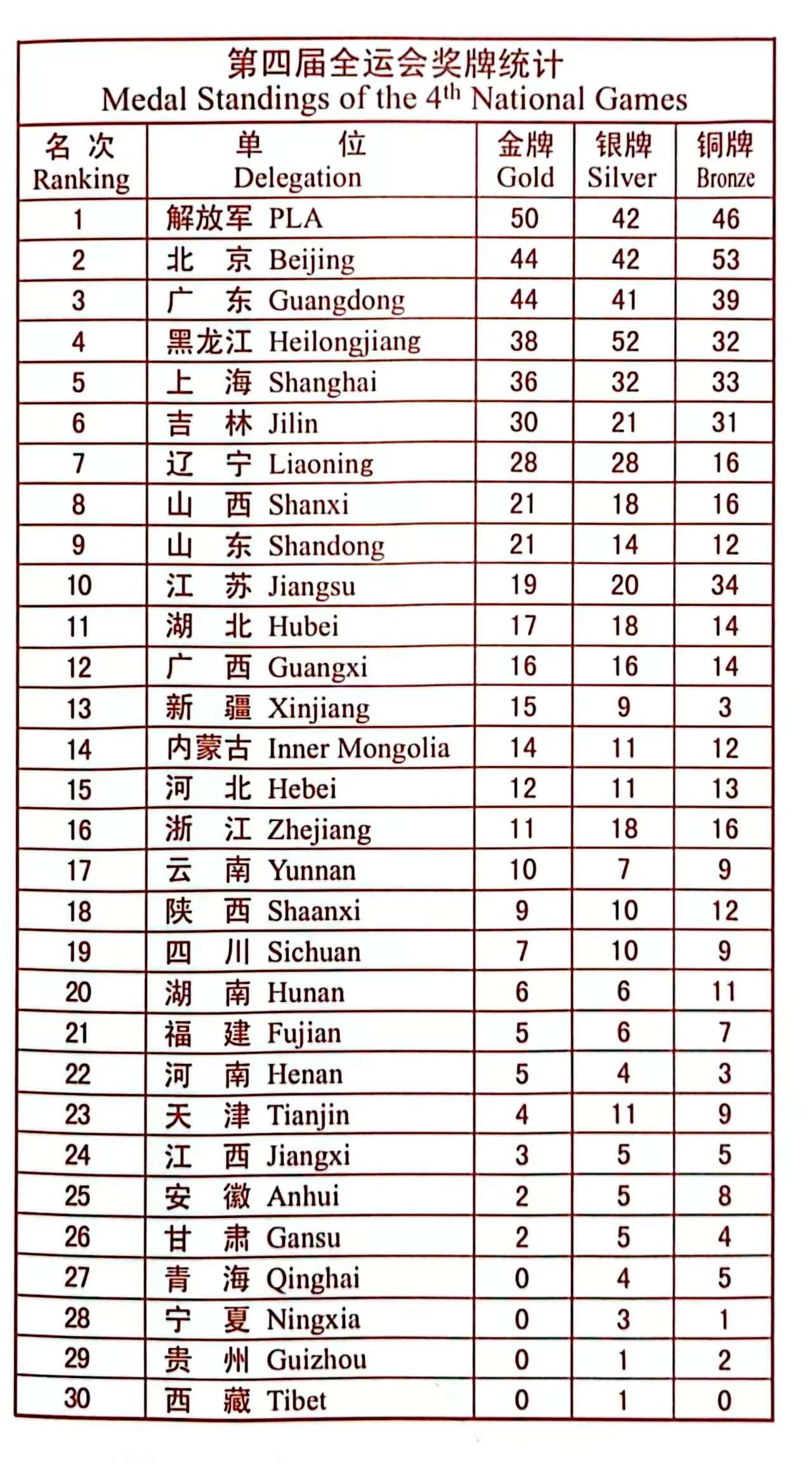 1979年9月15日至30日,中华人民共和国第四届全运会在北京举行。来自全国30个省、区、市(包括台湾省在内)和解放军组成的31个代表团的15189名运动员参加了比赛。其中到北京参加比赛的运动员为3824人。运动员参加了34项成年组和2项少年组共计36个项目的比赛。