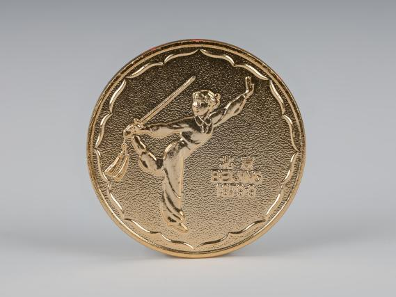 纪念币直径3cm,为金属材质。正面中心位置印有本届全运会会徽,四周环绕“中华人民共和国第四届运动会”中英文字样。背面为舞剑图案,一名女性运动员身姿矫健,动作优雅,图案体现运动员力量与美的融合,右下方印有本届全运会举办时间和地点。从第四届全运会开始,纪念币不仅作为参会纪念品,也首次面向市场发售。纪念币的设计与制作,展现了改革开放初期我国的币章铸造工艺,记载了中国体育事业的发展历程,是回顾全运会历史的珍贵纪念。