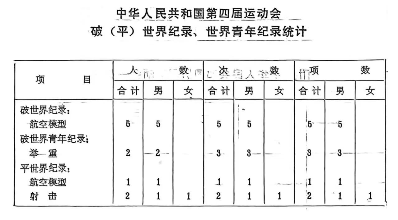 第四届全国运动会破(平)世界纪录、世界青年纪录统计表